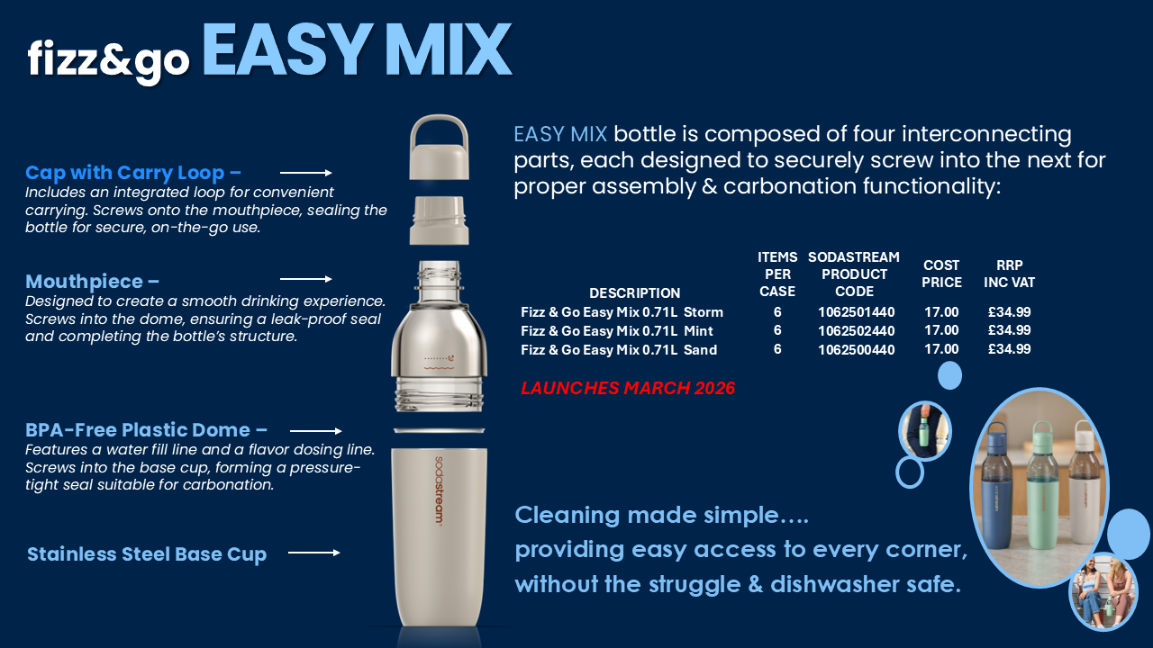 NEW for 2026 - Mix sparkling water machine: is a convenient, cordless fizzy drink maker that can carbonate any drink you desire in the comfort of your own home. From natural juices to wines and spirits*, enjoy the experience of crafting your favourite sparkling beverages at home.